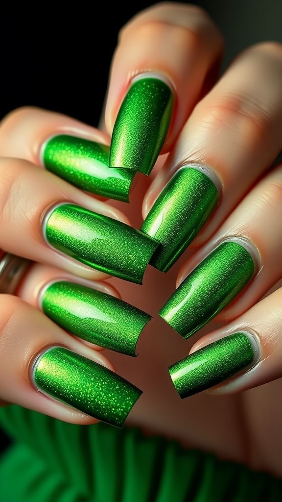 The glitter adds extra sparkle, reflecting the festive atmosphere of the celebration. This nail design can be achieved easily at home or by visiting a salon. If you’re feeling creative, you can even mix different shades of green for a more personalized look.