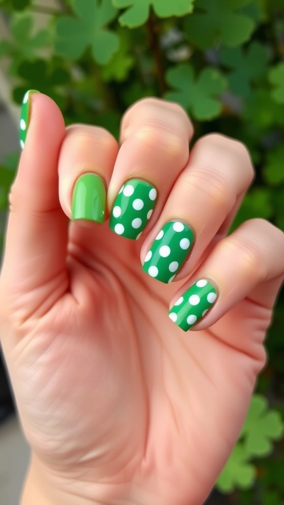 The bright green base represents the lush landscapes of Ireland, while the white dots bring a cheerful contrast. You can create this look with just a few simple steps. Start with a solid green polish, then use a dotting tool or a toothpick to carefully add the white dots.