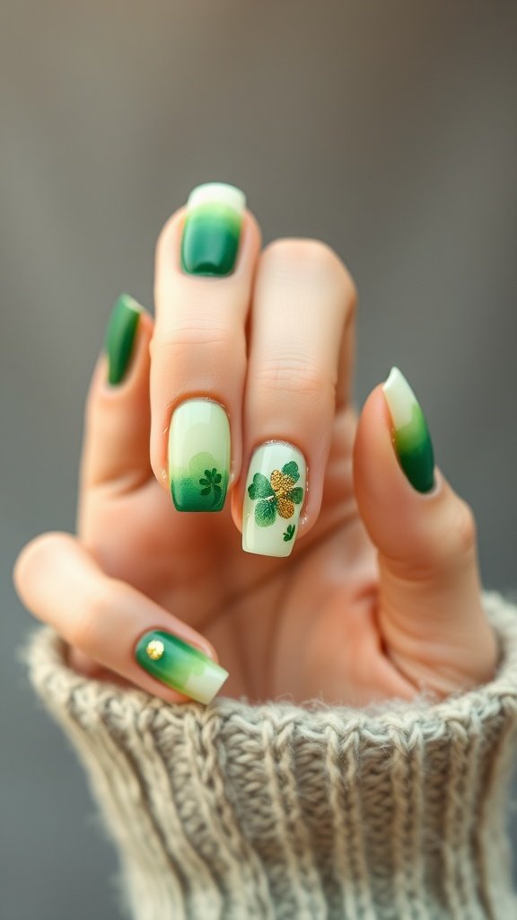 To recreate this style, consider using a sponge to apply the gradient. Start with a base coat, then layer your greens, finishing with small clover designs. Don’t forget to seal your artwork with a topcoat for a lasting finish!