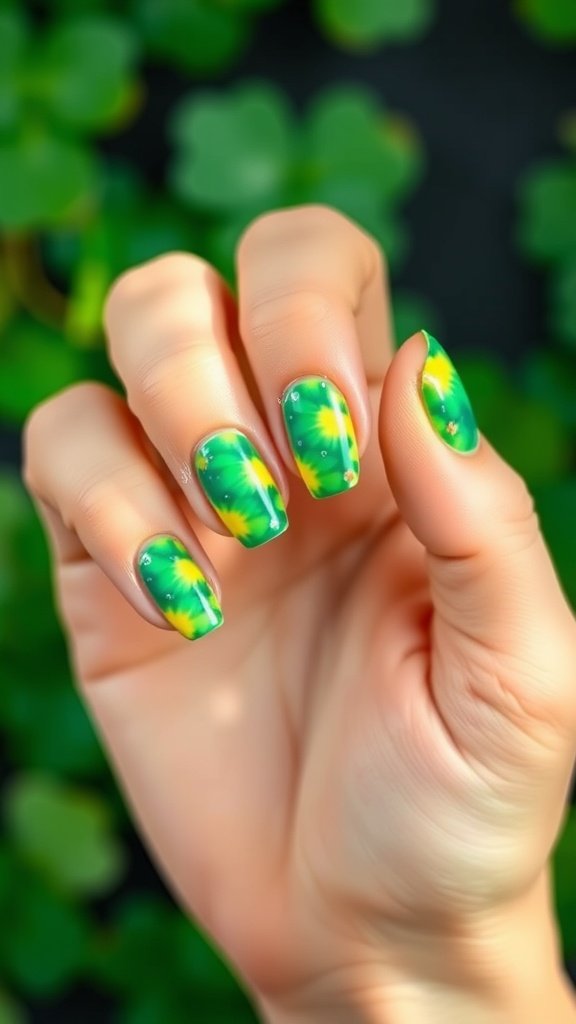 Get cozy with a fun twist on St. Patrick’s Day nail ideas by trying out a tie-dye design! This look features vibrant shades of green and cheerful yellow, perfect for celebrating in style. The tie-dye effect gives your nails a playful and artsy vibe, making them stand out while still being festive. It’s a fun way to show off your creativity and get into the spirit of the holiday. Plus, the mix of colors can remind you of lush green landscapes or even a rainbow, both of which are iconic symbols of St. Pat’s festivities. Whether you’re heading to a party or just want to add some cheer to your day, this nail art is sure to bring a smile.
